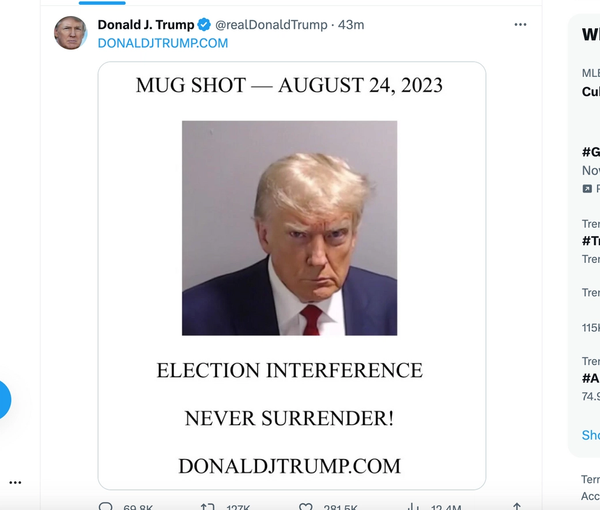 دونالد ترامپ با انتشار تصویری از خود در حال بازداشت در زندان فولتون کانتی در پلتفرم اکس، توییتر سابق، فعالیت در این شبکه اجتماعی را از سر گرفت، پس از خرید توییتر توسط ایلان ماسک، حساب توییتری ترامپ دوباره فعال شد. با این حال، او در این بازه زمانی هنوز هیچ مطلبی را در صفحه خود منتشر نکرده بود.